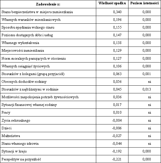 Tabela 5.15. Procent zmienności wskaźników zadowolenia z własnych osiągnięć, perspektyw i stylu życia wyjaśniany specyficznie przez poszczególne predyktory po wyłączeniu efektów pozostałych predyktorów oraz ranga predyktorów dla poszczególnych aspektów (w nawiasach dane z 2000 r.) 1.