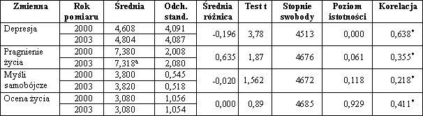 Źródło danych: lata 1992-1997 - Czapiński, 1998; rok 2000 -.Diagnoza społeczna 2000 (komputerowy zbiór danych). 5.1.2. Dane dla próby panelowej 2000-2003 Wyniki dowodzą, że w drugim pomiarze, w roku 2003 udziału nie wzięły głównie te osoby, które charakteryzował w pierwszym pomiarze, w 2000 r. generalnie nieco niższy dobrostan psychiczny. Na przykład w 2000 r. średnia w skali oceny całego dotychczasowego życia dla osób, które wzięły udział także w badaniu w 2003 r. wynosi 3,08, a dla respondentów, którzy nie wzięli udziału w kolejnym badaniu, średnia ta wynosi 3,14 (różnica istotna statystycznie), w skali depresji odpowiednio: 4,63 i 4,74 (różnica nieistotna), w skali skłonności samobójczych: 3,80 i 3,79 (różnica nieistotna) i w skali pragnienia życia: 7,39 i 7,27 (różnica istotna statystycznie). Ze względu na tę nierównoważność próby panelowej i podpróby, która wypadła z badania w 2003 r., wskaźnik dynamiki dobrostanu psychicznego oprzeć należy na próbie panelowej. Istotna statystycznie zmiana wystąpiła jedynie w zakresie natężenia symptomów depresji psychicznej: w 2003 r. depresja nieco wzrosła. Dla pozostałych, porównywalnych miar dobrostanu nie stwierdzono istotnej różnicy między dwoma pomiarami. Tabela 5.6. Porównanie wartości zmiennych ogólnego dobrostanu psychicznego z dwóch pomiarów - w 2000 i 2003 roku na próbie panelowej (tych samych respondentów)